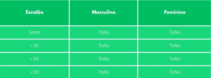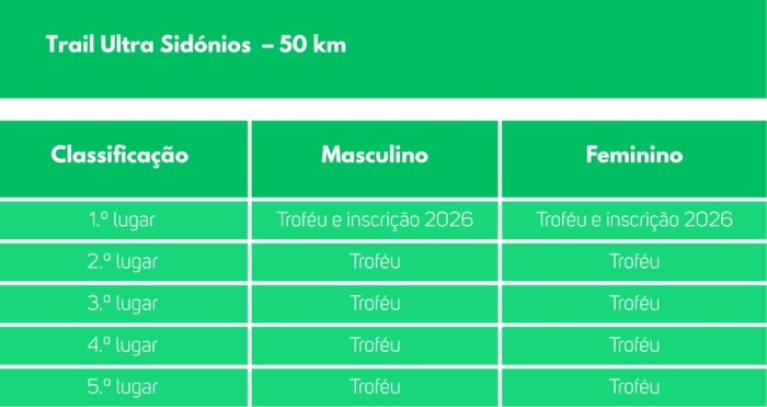 Troféu para os três primeiros classificados de cada escalão no Trail Ultra Sidónios – 50 Km, Trail Longo Crédito Agrícola Caixa Noroeste - 32 km, Trail Curto Martins & Filhos – 16 Km.