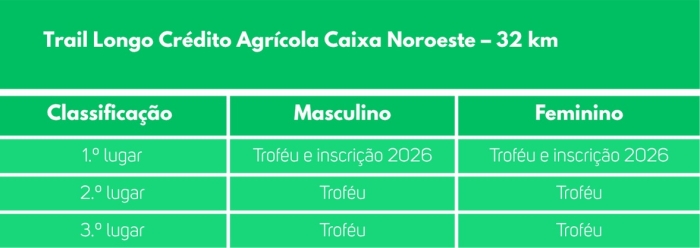 ** - Apenas no Trail Curto Martins & Filhos – 16 Km e Trail Longo Crédito Agrícola Caixa Noroeste - 32 Km