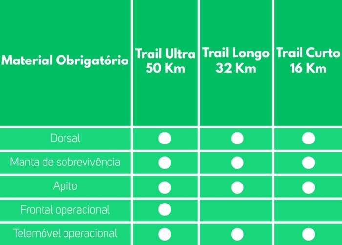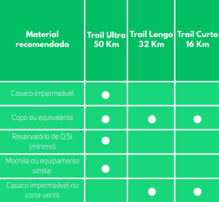 Todos os participantes nas provas do Trail Ultra Sidónios – 50 Km, Trail Longo Longo Crédito Agrícola Caixa Noroeste – 32 Km e Trail Curto Martins & Filhos – 16 Km deverão ter em atenção que, pela dureza da prova e dificuldades acrescidas pelas condições atmosféricas que se poderão verificar, têm de se fazer acompanhar de todo o material obrigatório durante toda a prova.